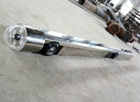 管道內觀察機是一臺機、電、訊、光一體化的自動觀察作業小車,包括攝像觀察機頭和機身兩大部分。機頭分為旋轉和固定兩部分。機身包括變徑調節機構、機載收發信號系統、機載控制系統、蓄電池組和驅動行走機構。機頭旋轉部分內裝攝像機和云臺,由電機帶動可向右擺動90度。機頭固定部分內裝電機及傳動機構,能帶動機頭旋轉部分轉動360度。機身前端通過燕尾式插槽、插板與機頭連接成一體。變徑調節機構采用燕尾滑板、滑道結構,用絲杠、絲母調節機頭上、下移動處于管道中心。驅動行走機構在機身后部,其余在機身前部和中部。主要用來觀察管道焊縫內表面缺陷和管內有無異物及施工質量有無問題,以便及時處理。
